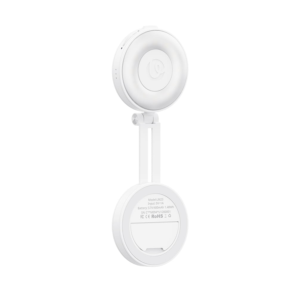 Pobór mocy lampy wynosi 1,1 W. Urządzenie posiada wbudowany akumulator 400 mAh, na którym może pracować przez 90 minut przy maksymalnej jasności. Lampka jest ładowana przez port USB-C - co istotne, może działać także podczas ładowania. Jej konstrukcja umożliwia wygodne ustawienie światła: panel jest obracany o 360° oraz pochylany o 180° w przód i tył. Dodatkowo, lampa posiada wysuwany łącznik o długości 4,5 cm. Mocny magnes zapewnia stabilność, a wewnętrzne lusterko ułatwia kontrolę kadru i szybkie poprawki makijażu.