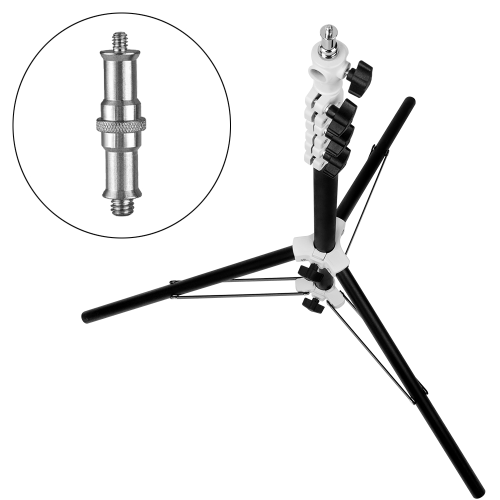 Główna kolumna statywu składa się z czterech sekcji blokowanych za pomocą ergonomicznych zacisków - motylków. Dwupunktowa blokada w trójnogu umożliwia dodatkowe manewrowanie jej położeniem. Solidna konstrukcja z metalu i aluminium sprawia, że na statywie z łatwością zamontujemy nawet dużą lampę pierścieniową czy prostokątny panel LED. Udźwig statywu wynosi 5 kg. Na uwagę zasługuje także konstrukcja głowicy – demontowany, dwustronny trzpień 16 mm może być zamontowany w pionie lub poziomie, oferując użytkownikowi gwint 1/4 lub 3/8''.