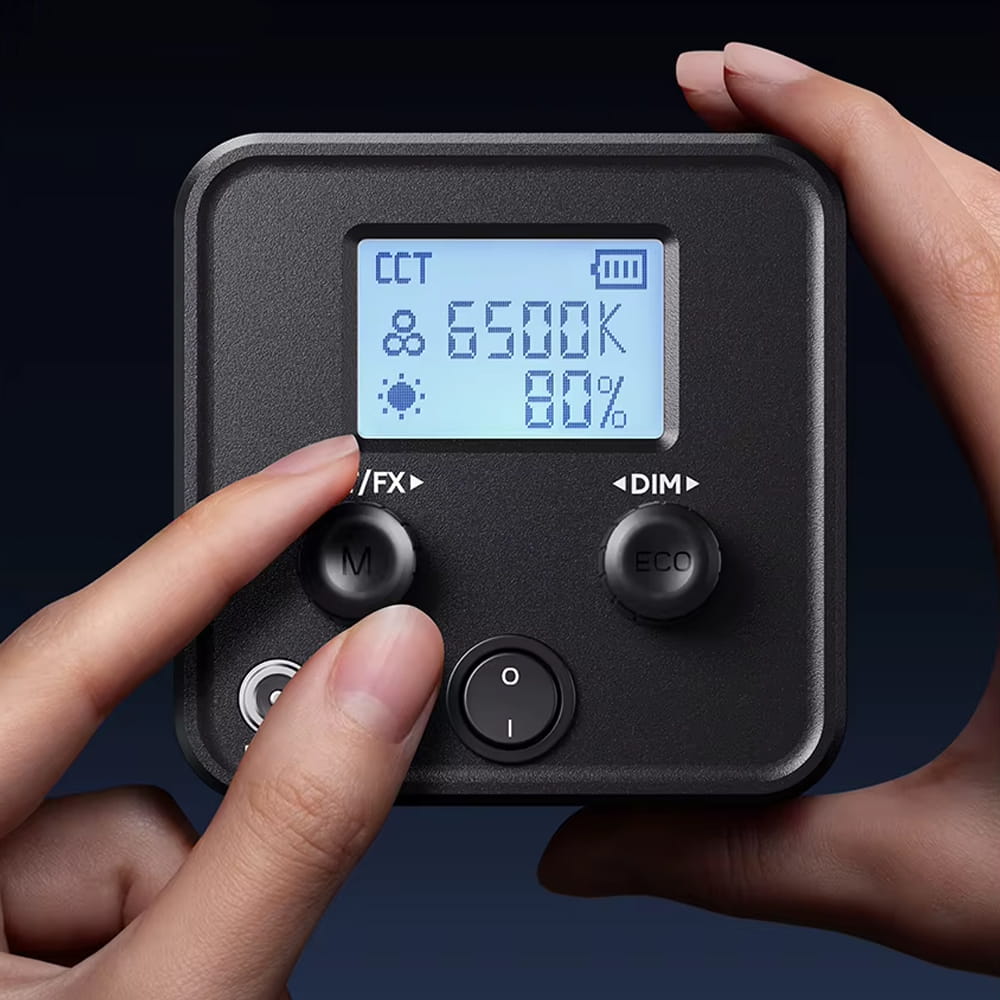 Dużą zaletą lampy jest wysoki współczynnik CRI 95+, który pomaga zachować naturalne i spójne kolory w kadrze. Przy temperaturze 6500 K lampa osiąga moc na poziomie 8000 lux @ 0,5 m, dzięki czemu z powodzeniem może pracować jako główne źródło światła w niewielkich i średnich setupach. Obsługa urządzenia odbywa się za pomocą uproszczonego panelu sterowania oraz pomocniczego wyświetlacza, co ułatwia szybkie wprowadzanie zmian podczas pracy.