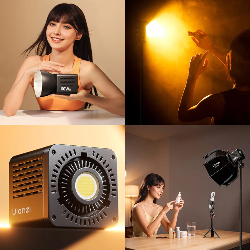 Ulanzi C60Bi sprawdzi się podczas nagrań wideo, fotografii produktowej, portretów, streamingu oraz tworzenia treści do social mediów. Dzięki kompaktowej konstrukcji i wbudowanemu akumulatorowi może być wygodnym źródłem światła zarówno w studiu, jak i podczas pracy w terenie. Obsługa modyfikatorów mini Bowens daje większą swobodę przy budowaniu prostych i bardziej rozbudowanych setupów oświetleniowych.