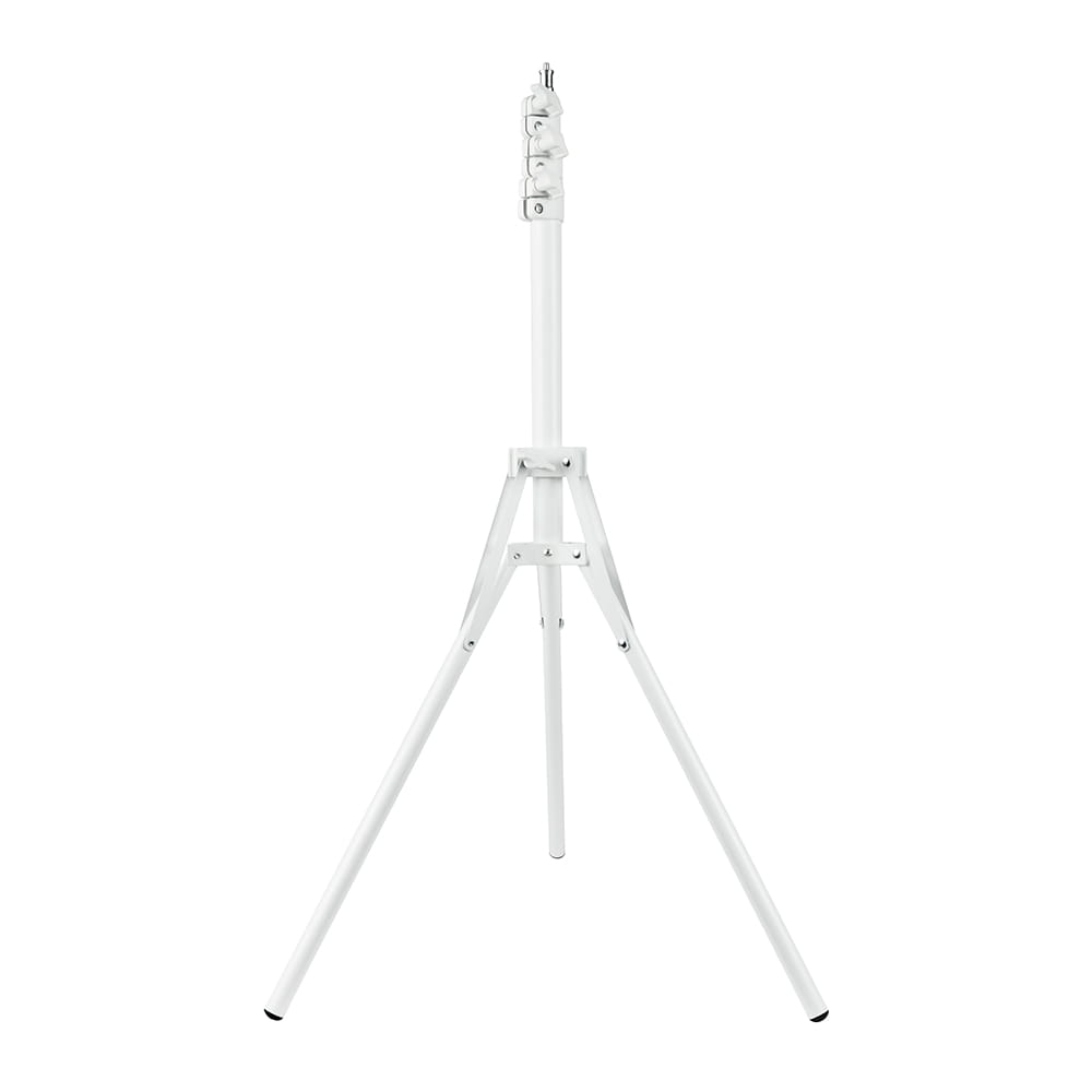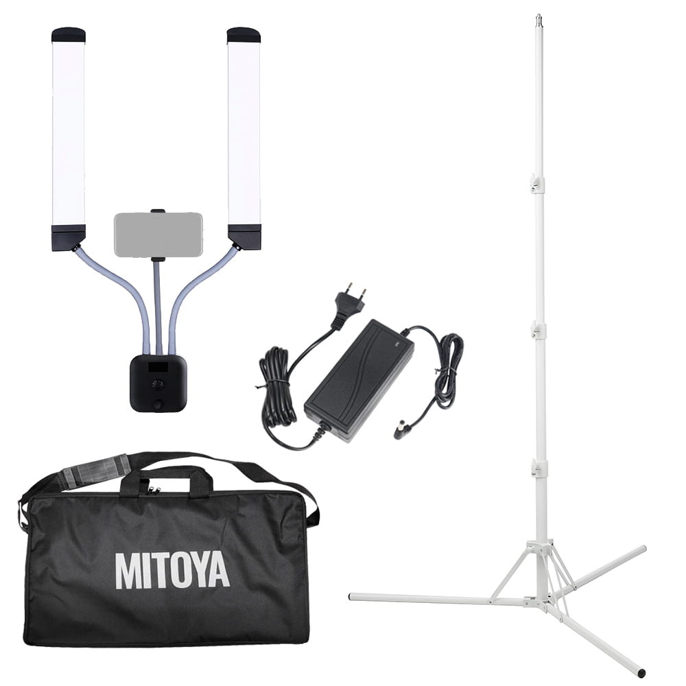 Zestaw uzupełnia lekki, mobilny i uniwersalny statyw IBIS (F200 White). IBIS to podstawowy model statywu w ofercie MITOYA - jest wykonany z aluminium i tworzywa oraz pasuje do lamp pierścieniowych czy niewielkich lamp panelowych. Posiada głowicę w standardzie 16 mm z dodatkowym gwintem 1/4'', na którą należy nasadzić lampę i ustabilizować ją, dokręcając boczną śrubę. Wysokość statywu IBIS jest płynnie regulowana od 50 do 185 cm. Jego długie, grube nóżki mogą być ustawione w klasyczny trójkąt lub rozłożone płasko na podłodze - w tej pozycji jego maksymalna wysokość wynosi 145 cm.