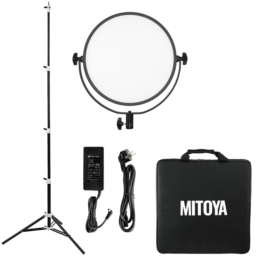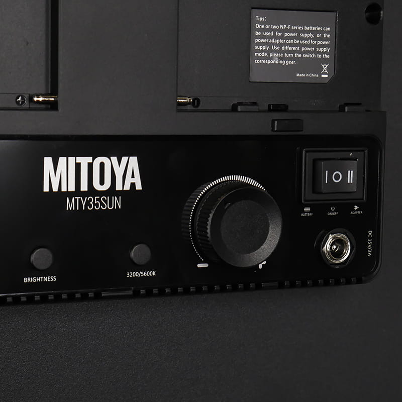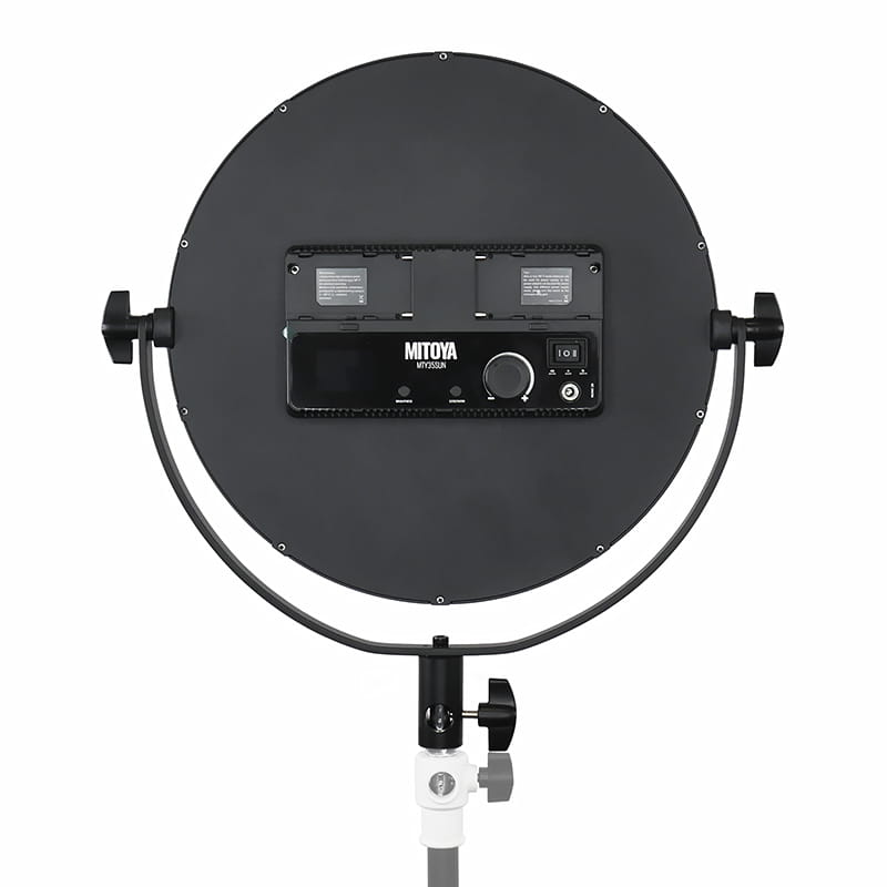 MITOYA SUN35 to lampa z regulacją mocy i temperatury barwowej od 3200 do 5600 K. Okrągły panel składa się z 272 diod LED, których połowa emituje światło ciepłe, a druga połowa światło chłodne (neutralnie białe). Temperatura barwowa jest regulowana co 100 K, zaś moc światła co 1%, dzięki czemu w prosty sposób możemy ustalić najkorzystniejsze parametry pracy. Lampa wiernie odwzorowuje kolory – jej współczynnik CRI wynosi 95+.