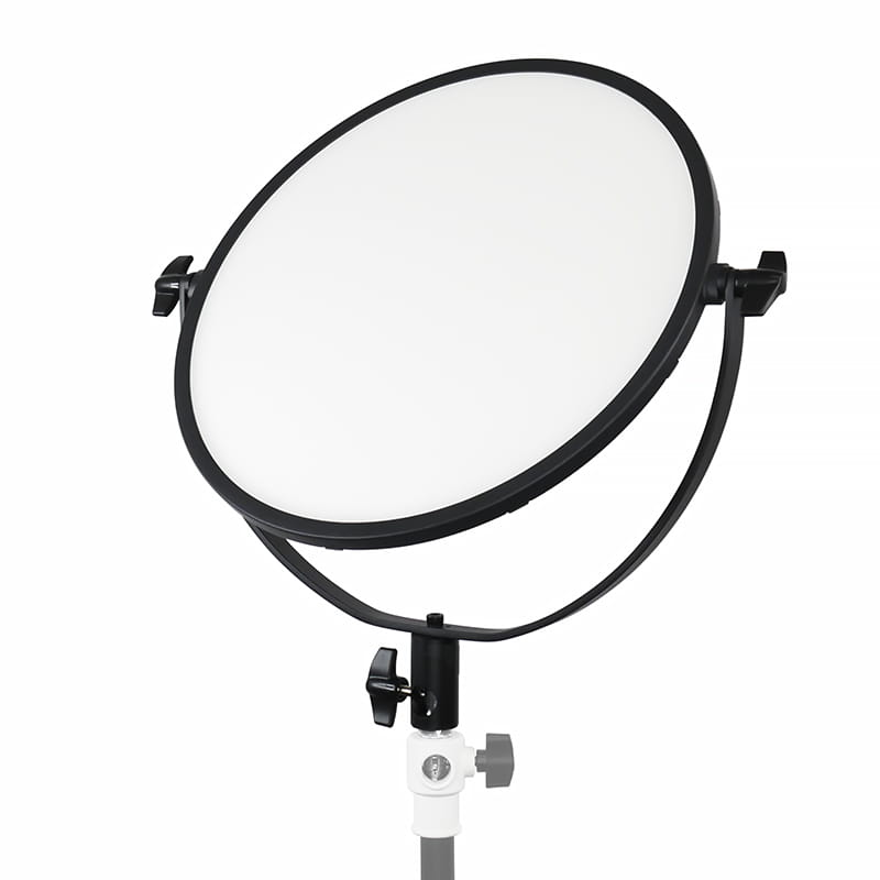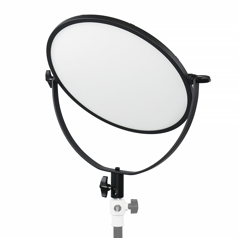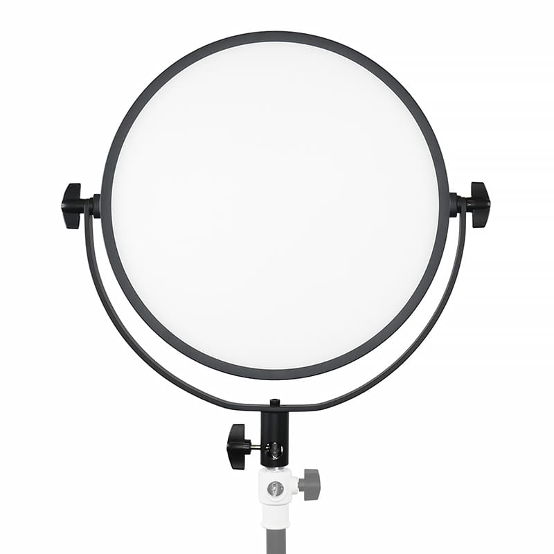 Diody pozwalają uzyskać jednorodne, mocne światło. Wbudowany na stałe dyfuzor z mlecznobiałego tworzywa intensywnie je rozprasza. Światło jest bardzo miękkie, dzięki czemu korzystnie oświetla skórę twarzy. Średnica zewnętrzna lampy wynosi 33 cm, z czego powierzchnia dyfuzora ma aż 30,5 cm, zaś grubość panelu to zaledwie 1 cm! Lampa jest umieszczona w półokrągłym uchwycie, który pozwala obracać ją o 360º i blokować w wybranym położeniu. Całość jest montowana na statyw oświetleniowy z głowicą 16 mm.