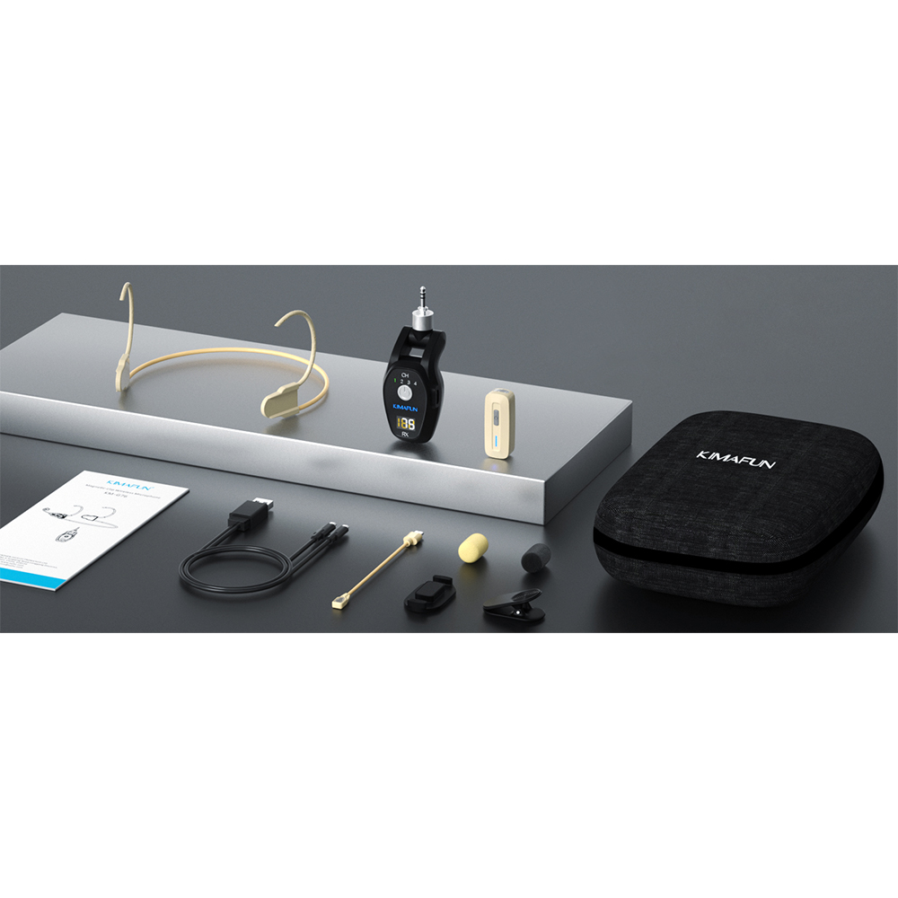 Kimafun KM-G76 Beige to bezprzewodowy mikrofon nagłowny 2w1 bazujący na komunikacji radiowej 2,4 GHz. Spośród innych modeli, wyróżnia się możliwością demontażu nadajnika z opaski nagłownej i jego niezależnego wykorzystywania jako mikrofon krawatowy lavalier lub handheld.