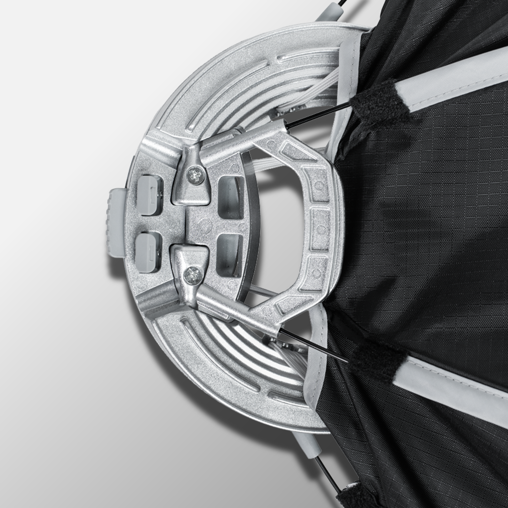 Profilowany uchwyt jednocześnie napina wszystkie druty rozporowe. Softbox rozkłada się szybko i bez użycia dużej siły. Po prawidłowym naprężeniu konstrukcja blokuje się automatycznie. Delikatne kliknięcie informuje, że softbox jest gotowy do pracy.
