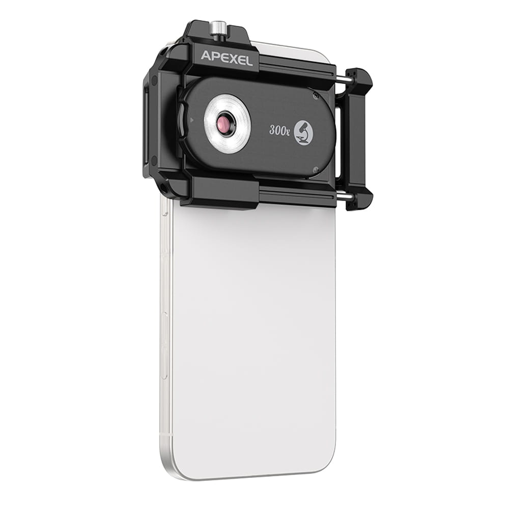 Mikroskop do telefonu Apexel APL-MS300 to miniaturowy obiektyw, umożliwiający rejestrowanie najdrobniejszych szczegółów w dużym powiększeniu. Jego układ optyczny, oparty na 4 elementach w 4 grupach, oferuje przybliżenie rzędu 300x. Wbudowany filtr polaryzacyjny (CPL) redukuje odblaski, ułatwiając prowadzenie precyzyjnych obserwacji, szczególnie roślin czy owadów.