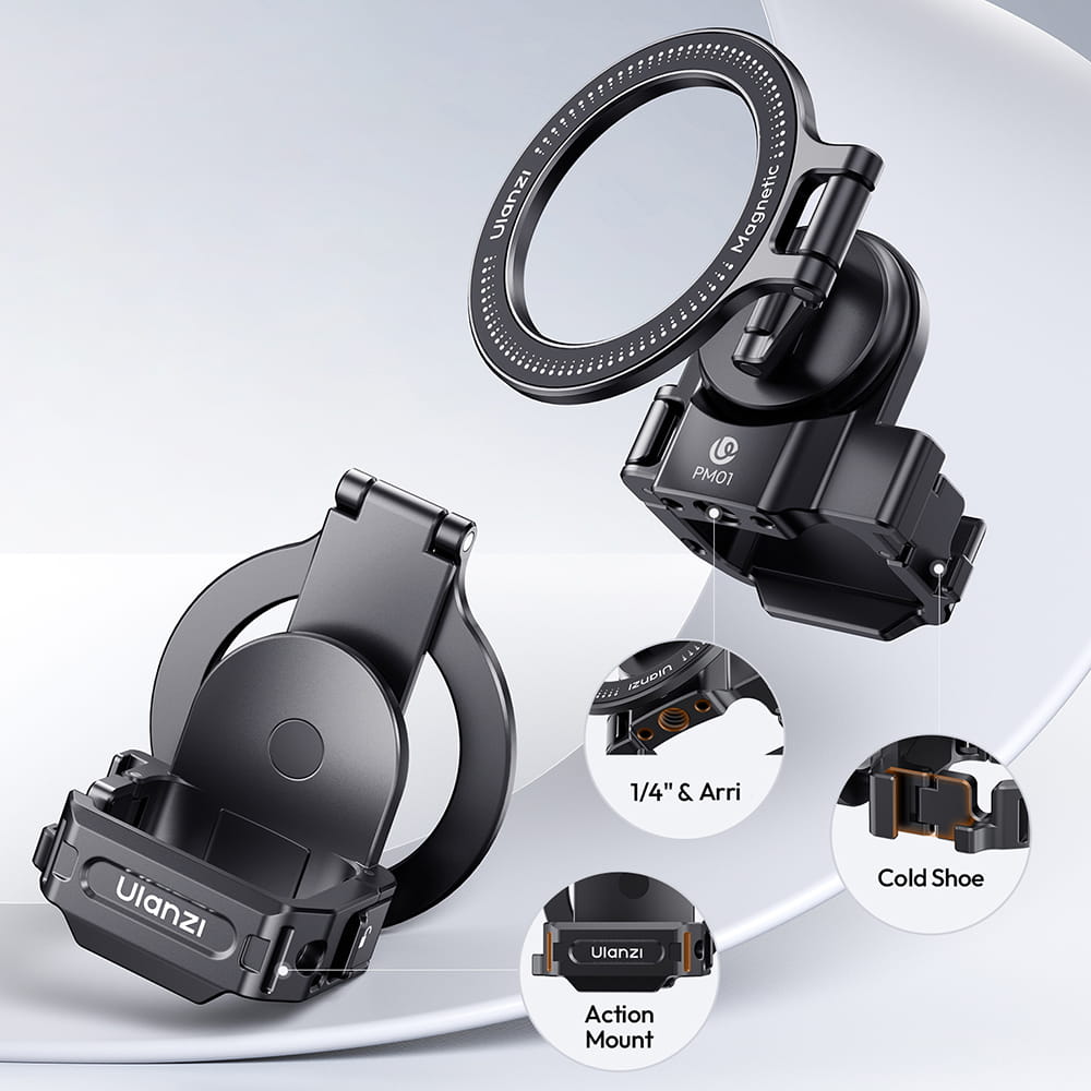 Ulanzi C065 PM01 Pocket 3 Magnetic Expansion Adapter to wszechstronny uchwyt montażowy do kamery DJI Osmo Pocket 3 oraz smartfonów z magnetycznym mocowaniem typu MagSafe (wybrane modele iPhone, Google Pixel i inne). Profilowane mocowanie umożliwia bezpieczne i stabilne osadzenie kamerki Osmo Pocket 3 z zachowaniem dostępu do portów i przycisków. Dodatkowym udogodnieniem jest możliwość ładowana kamery bez konieczności demontażu uchwytu. Całość może być nakręcona na statyw fotograficzny z gwintem 1/4'', a przy tym jest zgodna ze standardem Action Mount.