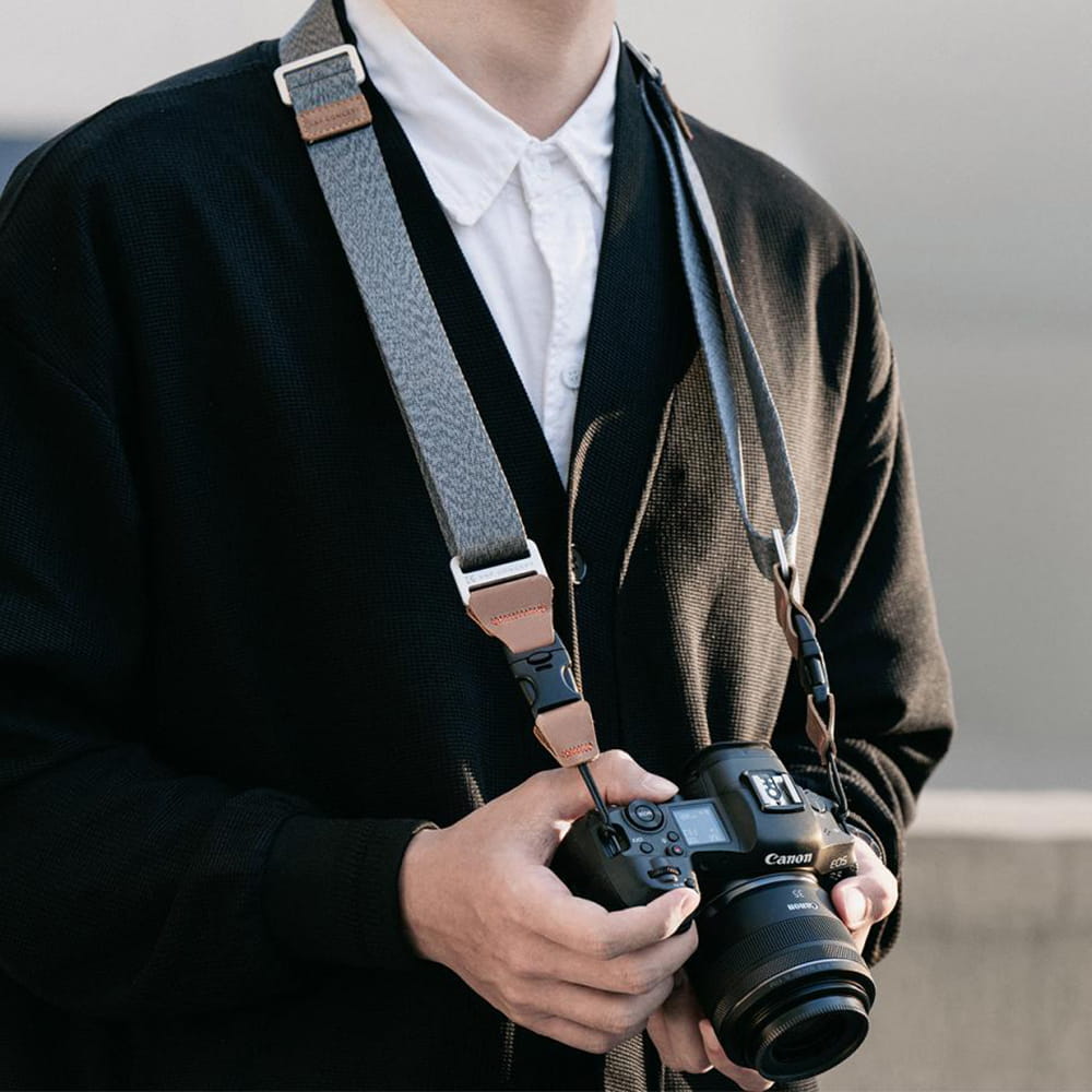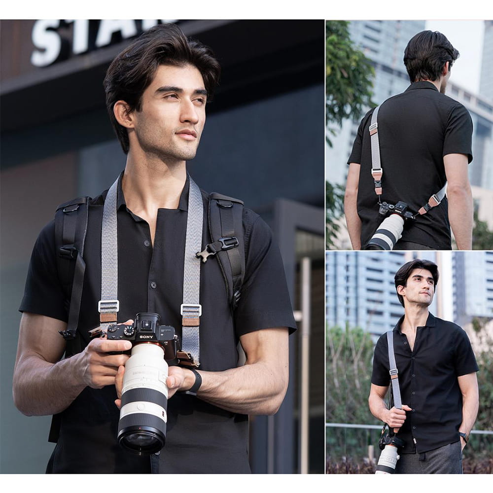 Pasek może być noszony na ramieniu, szyi lub na skos klatki piersiowej (crossbody). Regulacja długości 100-160 cm pozwala dopasować go do wzrostu i postury użytkownika, a deklarowany udźwig 3 kg zapewnia odpowiedni zapas wytrzymałości nawet przy cięższych korpusach i obiektywach z zaawansowaną optyką. Całość dopełnia estetyczne wykończenie z elementami eko-skóry oraz klasyczny, minimalistyczny design.