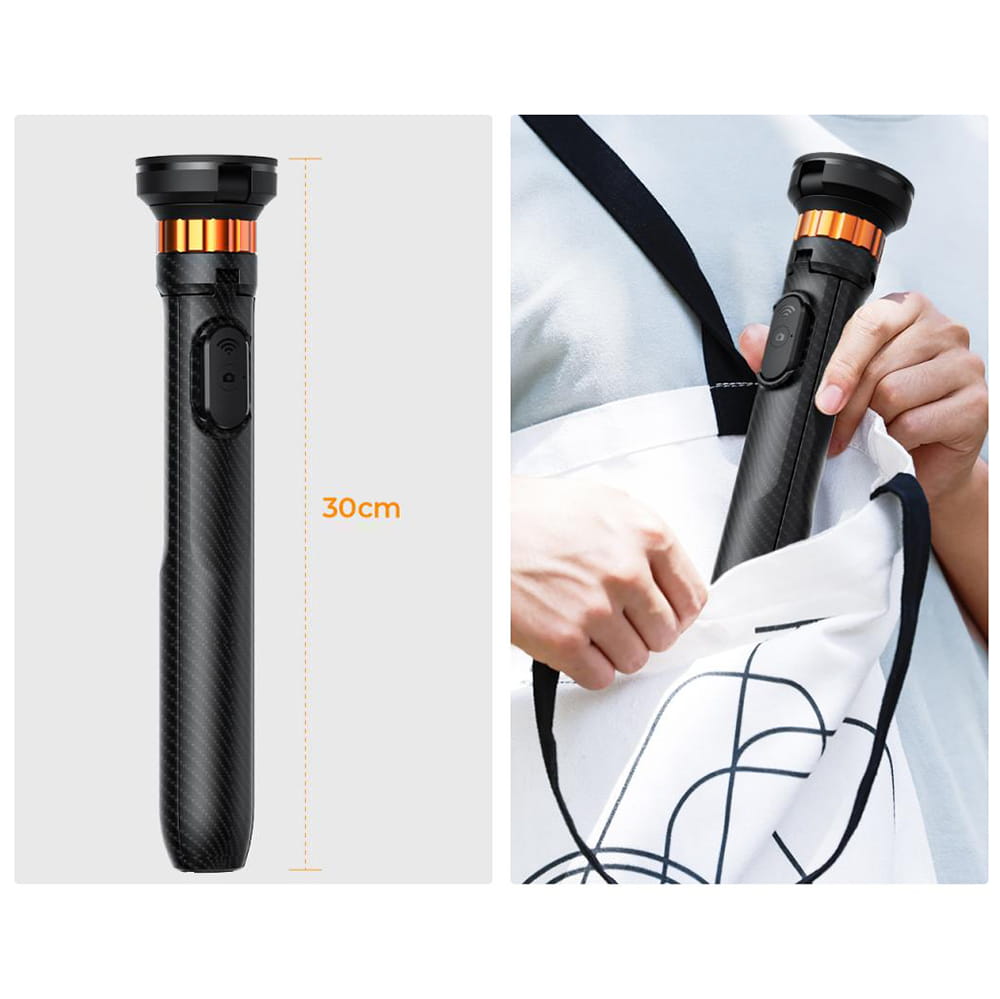 Statyw jest prosty w obsłudze i wygodny w transporcie. Jego nóżki zostały pokryte warstwą karbonu, co nadaje im charakterystyczną, przyjemną w dotyku strukturę. Jedna z nóżek posiada profilowane mocowanie na pilot Bluetooh. Sam pilot jest zasilany wymienną baterią CR1632 i umożliwia zdalne wyzwalanie migawki na odległość do 10 m.
