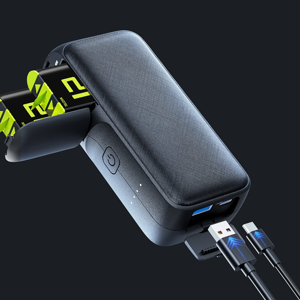Urządzenie posiada dwa sloty na akumulatory do GoPro HERO 12 / 11 / 10 / 9, a w zestawie znajdziemy dodatkowe adaptery, które pozwolą nam również na naładowanie akumulatorów GoPro poprzednich generacji (8 / 7 / 6 / 5). Każdy ze slotów ma wskaźnik LED, który informuje o bieżącym stanie naładowania. Na spodzie etui umieszczona została gumowa zaślepka, pod którą znajdziemy dwa złącza USB (USB-C i USB-A) przeznaczone do ładowania urządzeń zewnętrznych lub podpięcia samego powerbanka do prądu.