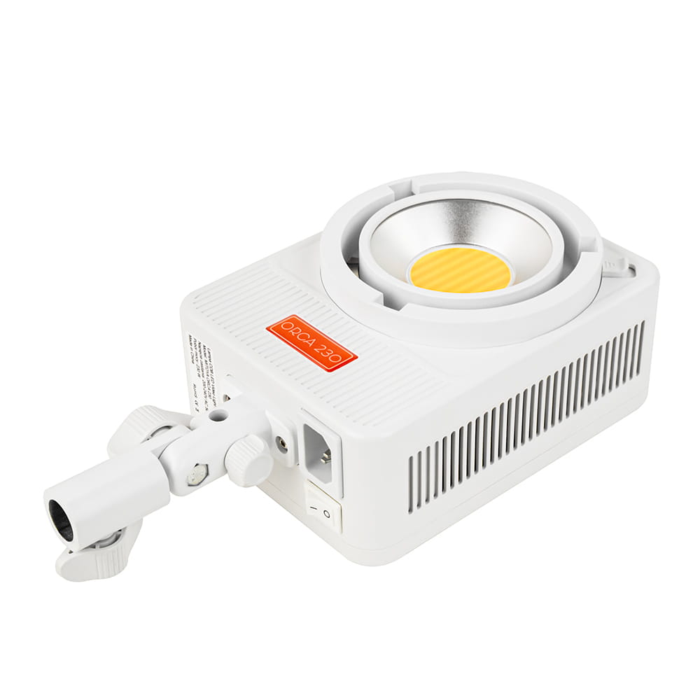 MITOYA ORCA 230 Bi-color to lampa światła stałego typu spotlight ze adapterem Bowens. Wyposażona w COB LED chroniony szklaną osłoną, emituje intensywne światło pozbawione efektu migotania. Płynnej regulacji mocy towarzyszy zmiana temperatury barwowej 2700-6500 K oraz sześć trybów tematycznych, ułatwiających tworzenie kreatywnych efektów filmowych. Strumieniowi świetlnemu 18 300 lm towarzyszy CRI 95+, gwarantujące wierną reprodukcję kolorów.