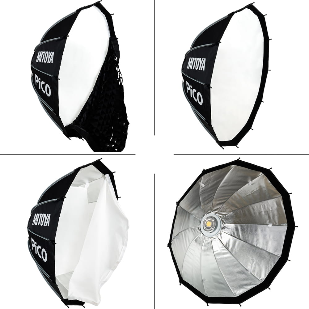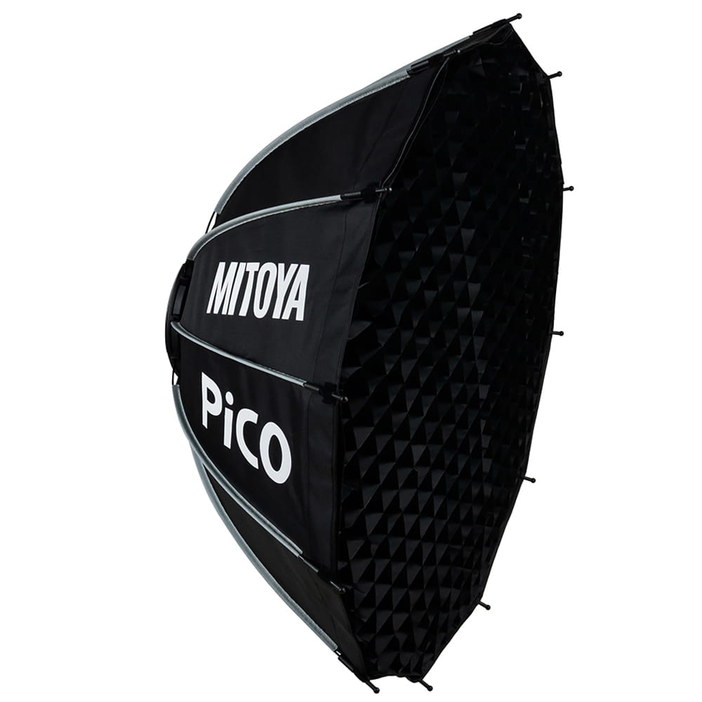 MITOYA PICO 85 cm to dwunastokątny softbox studyjny wyposażony w mocowanie Bowens. PICO posiada dwa dyfuzory (wewnętrzny i zewnętrzny) oraz grid z gęstą siatką oczek. Oferuje system szybkiego rozkładania opierający się na drutach poprowadzonych na zewnątrz czaszy. Każdy drut jest naprężany niezależnie i blokowany za pomocą zatrzasków. Wnętrze softboxa pozostaje puste i żaden element nie przesłania palnika lampy. Pozwala to uzyskać wyjątkowo równomierne oświetlenie pozbawione cieni. Wnętrze czaszy zostało wyłożone srebrną, odbijającą tkaniną.