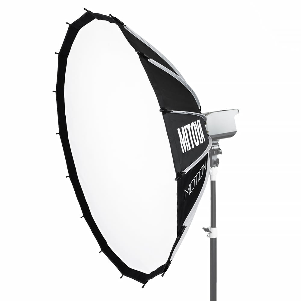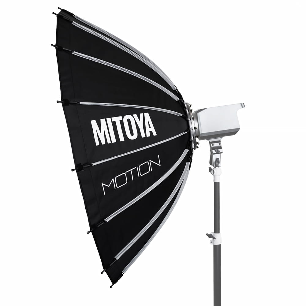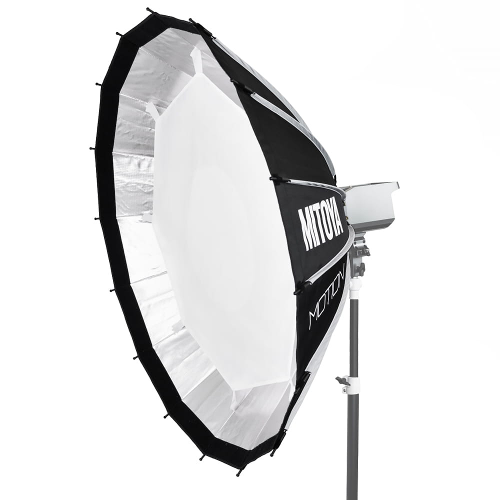 Zaawansowany softbox studyjny MITOYA MOTION o kształcie szesnastokąta i średnicy 105 cm. Posiada zintegrowany adapter montażowy systemu Bowens i unikatowy mechanizm szybkiego rozkładania, dzięki któremu przygotowanie planu zdjęciowego zajmuje dosłownie kilka chwil. W komplecie z softboxem znajdują się dwa dyfuzory – wewnętrzny z dodatkowym podszyciem niwelującym hot spot i zewnętrzny o jednolitej strukturze, a także grid z gęstą siatką oczek.