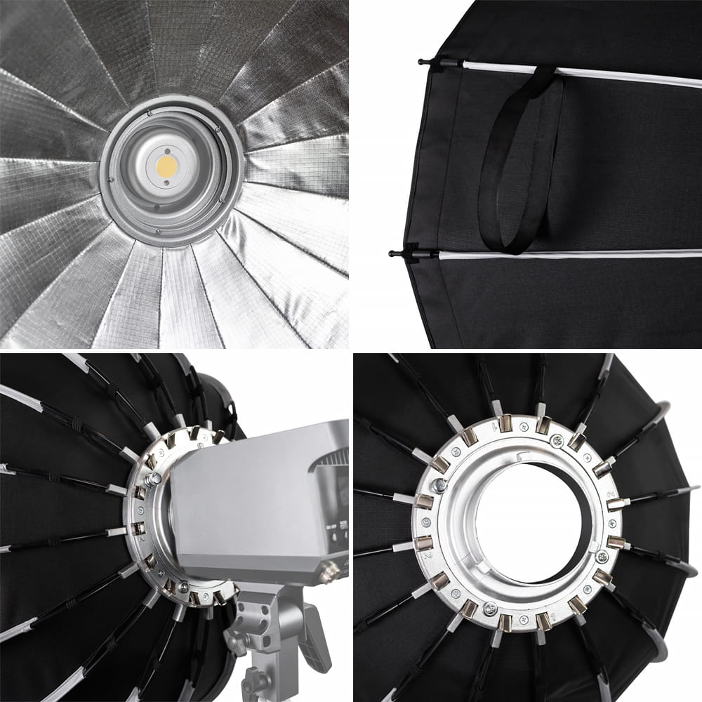 Softboxy MITOYA MOTION to zaawansowane i wysokiej jakości modyfikatory światła, zaprojektowane aby maksymalnie skrócić czas pracy fotografów i filmowców, dbając jednocześnie o jej komfort. Szesnastokątny (heksadekagonalny) softbox paraboliczny o średnicy 120 cm to doskonały produkt na potrzeby stacjonarnego studia fotograficznego lub planu zdjęciowego. Doskonale spisze się podczas wykonywania portretów artystycznych oraz biznesowych, jak również podczas tworzenia vlogów czy prowadzenia live'ów. Jego pogłębiona czasza ułatwia uzyskanie plastycznego oświetlenia, skupionego na głównym obiekcie. Dołączone do zestawu dyfuzory oraz grid umożliwiają uzyskanie różnorodnych efektów. Ciesz się profesjonalnym oświetleniem oraz maksymalnym komfortem pracy razem z softboxami MITOYA!