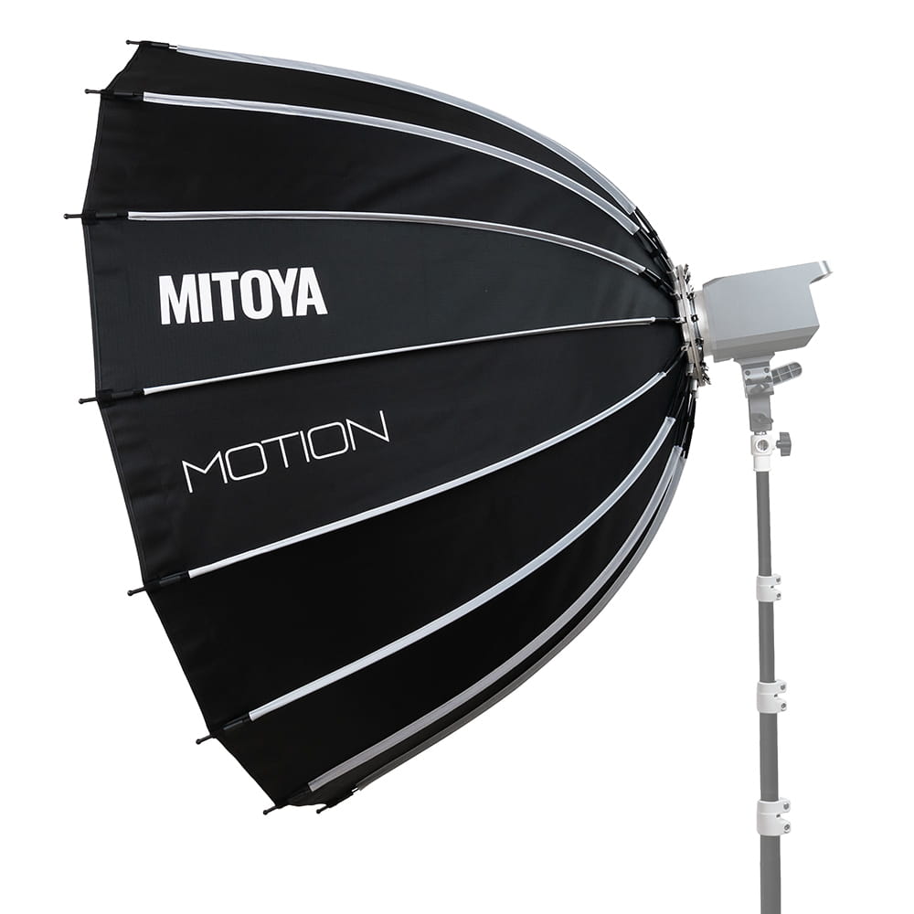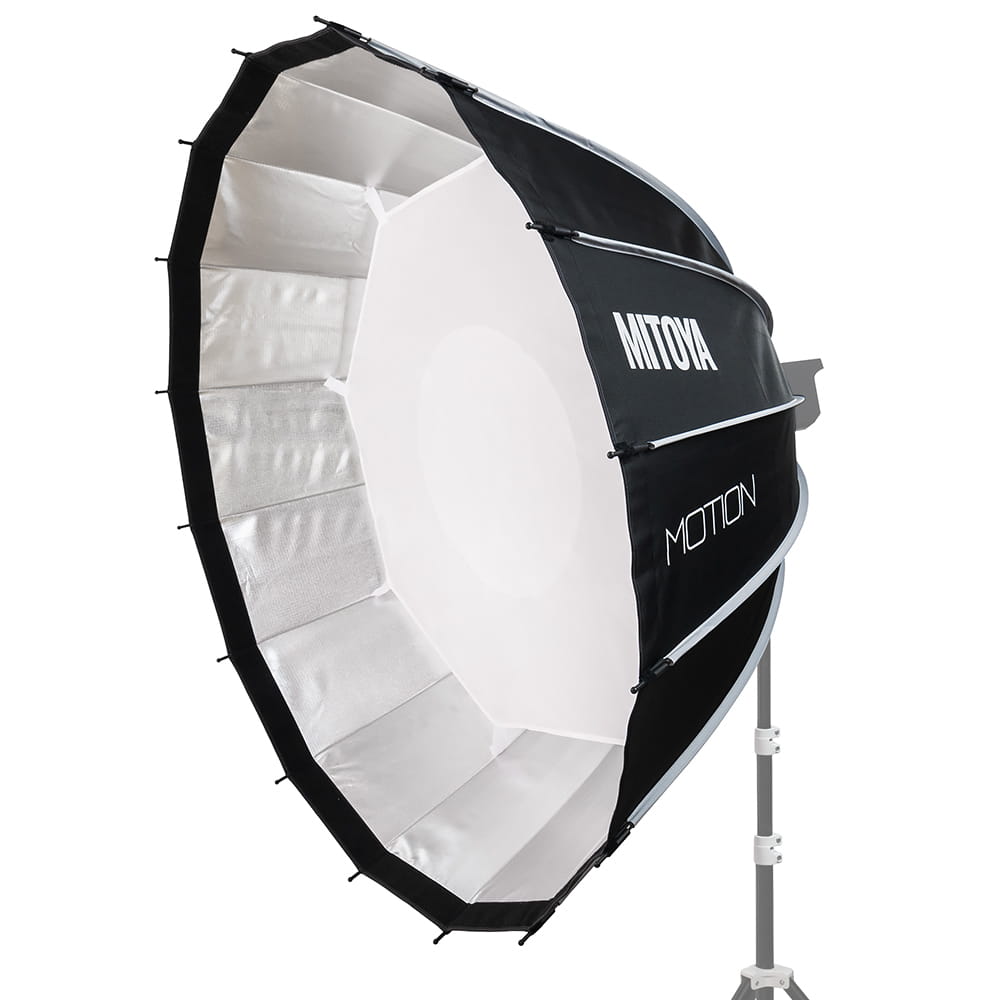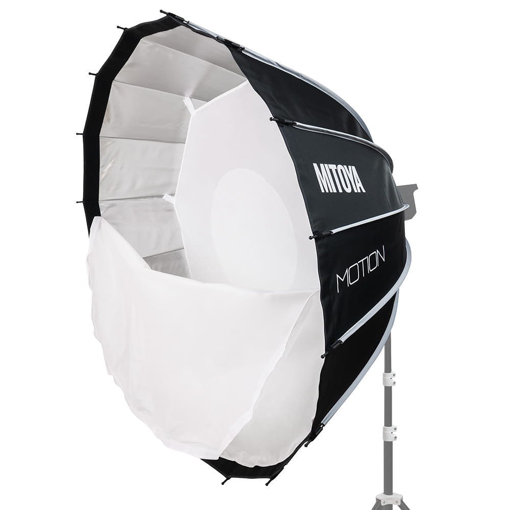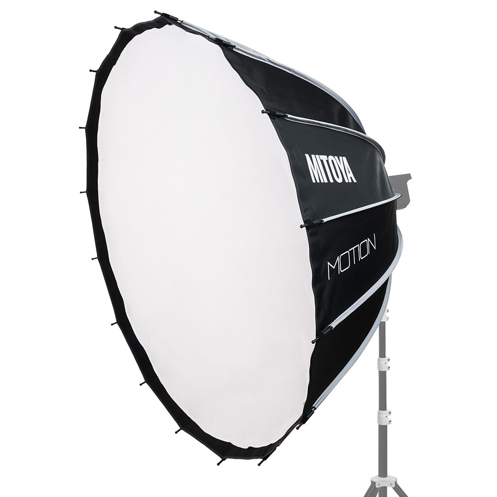Softbox studyjny MITOYA MOTION o średnicy 120 cm i pogłębionej, parabolicznej czaszy. Złożony z szesnastu drutów posiada zintegrowane mocowanie typu Bowens i mechanizm szybkiego rozkładania. W komplecie dwa dyfuzory – wewnętrzny z dodatkowym podszyciem niwelującym hot spot i zewnętrzny o jednolitej strukturze, a także grid z gęstą siatką oczek.