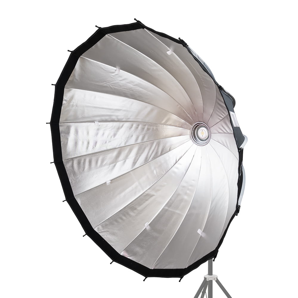 Projekt stelaża z drutami poprowadzonymi na zewnątrz czaszy sprawia, że wnętrze MITOYA MOTION jest puste i żaden element konstrukcyjny nie przesłania palnika lampy. Emitowane światło rozchodzi się równomiernie, a na dyfuzorze nie tworzą się niepożądane cienie. Jest to szczególnie istotne podczas realizacji video i pracy z lampami LED. Wewnętrzna srebrna warstwa odbijająca dodatkowo wzmacnia światło, co pozwala w pełni wykorzystać potencjał lampy oraz uzyskać strumieniowo skupione oświetlenie planu.