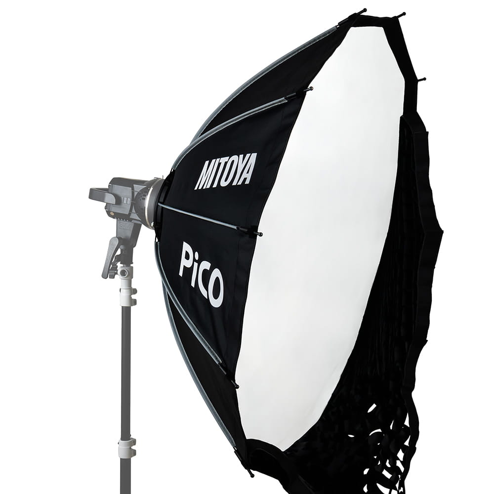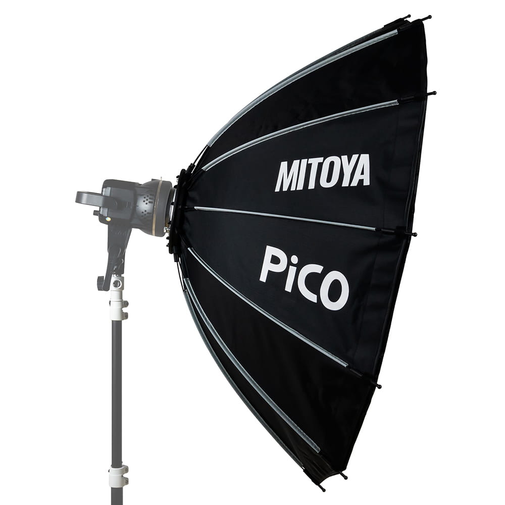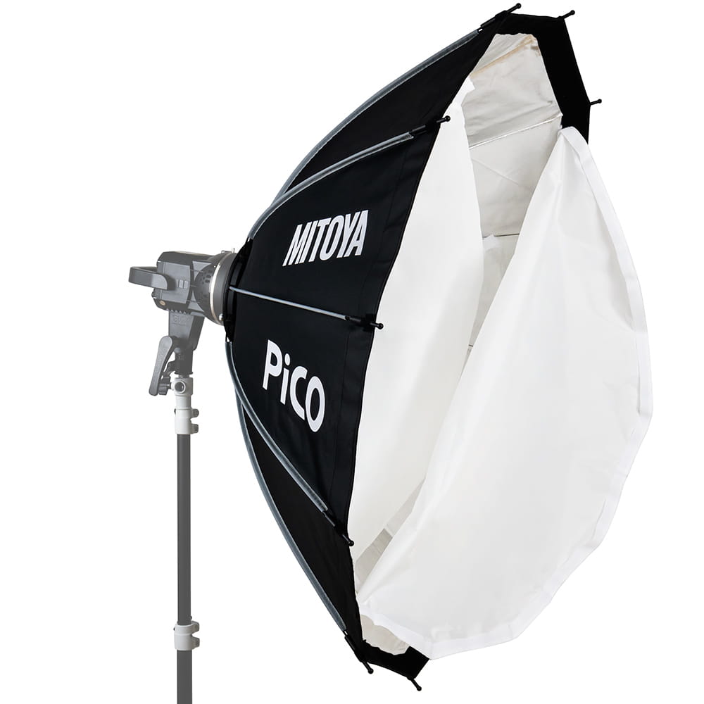 MITOYA PICO został wyposażony w system szybkiego rozkładania oparty na drutach poprowadzonych na zewnątrz czaszy. Każdy z nich jest naprężany niezależnie i blokowany za pomocą zatrzasków. Przeniesienie konstrukcji rozporowej na zewnątrz sprawia, że wnętrze czaszy pozostaje puste i żaden element nie przesłania palnika lampy. Dzięki temu możliwe jest uzyskanie wyjątkowo równomiernego oświetlenia pozbawionego cieni, co jest szczególnie istotne podczas tworzenia video. Wnętrze czaszy jest wyłożone srebrną, odbijającą tkaniną, której zadaniem jest dodatkowe odbicie i wzmocnienie światła.