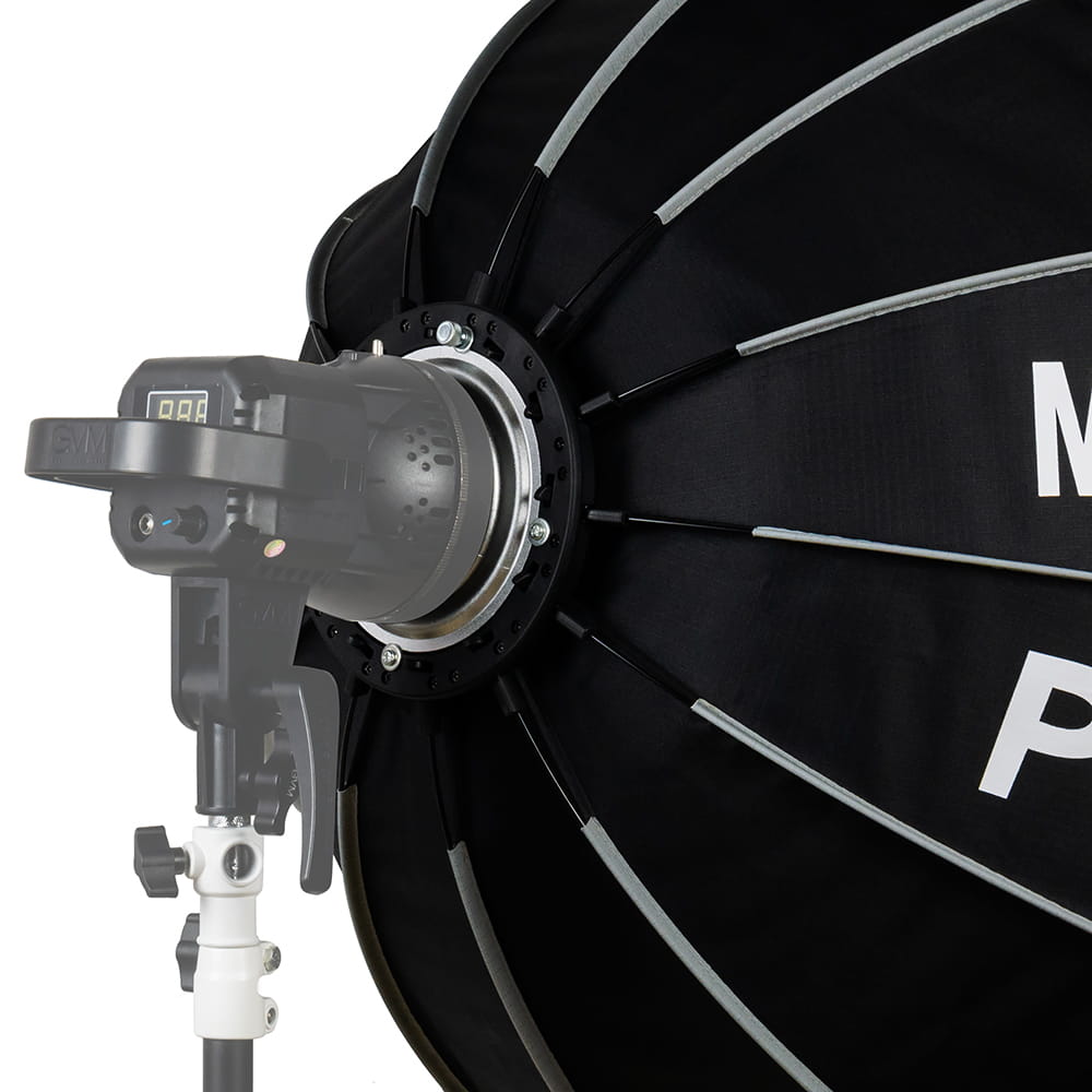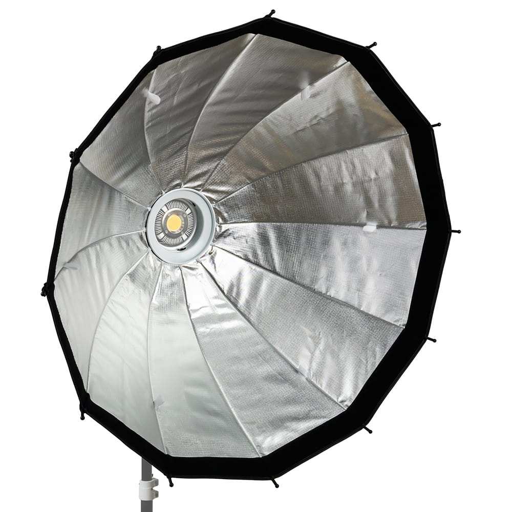 Softbox oferuje system szybkiego rozkładania opierający się na drutach poprowadzonych na zewnątrz czaszy. Każdy drut jest naprężany niezależnie i blokowany za pomocą niewielkich zatrzasków. Przeniesienie konstrukcji rozporowej na zewnątrz sprawia, że wnętrze softboxa pozostaje puste i żaden element nie przesłania palnika lampy. Pozwala to uzyskać wyjątkowo równomierne oświetlenie pozbawione cieni - szczególnie istotne podczas tworzenia form video. Wnętrze czaszy zostało wyłożone srebrną, odbijającą tkaniną.