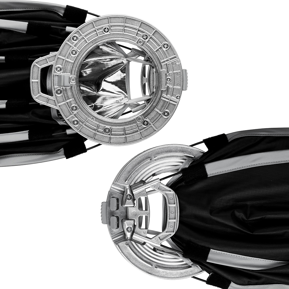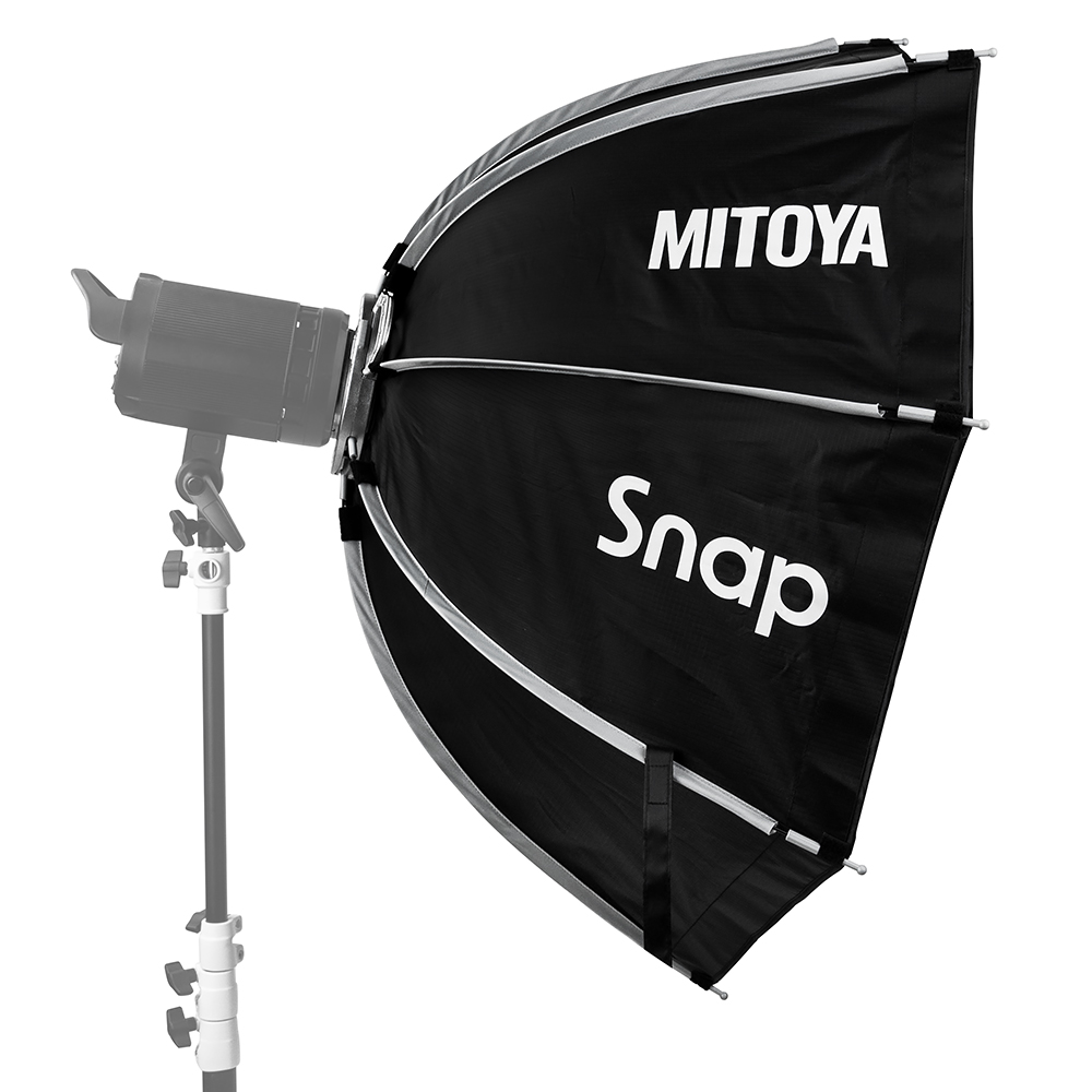 Seria modyfikatorów światła MITOYA SNAP to softboxy wyróżniające się innowacyjnym mechanizmem one-click. Druty rozporowe są na stałe połączone z adapterem Bowens, a do ich rozłożenia służy profilowany uchwyt - jego naciągnięcie napręża wszystkie żebra jednocześnie, co niweluje konieczność ich pojedynczego blokowania. Poprawne naprężenie czaszy jest sygnalizowane cichym kliknięciem. Za bezpieczeństwo pracy odpowiada mechanizm zwalniający, który chroni konstrukcję przed przypadkowym złożeniem. Istotną cechą konstrukcyjną softboxów SNAP jest także fakt, że składają się na płasko, co ułatwia ich transport i przechowywanie.