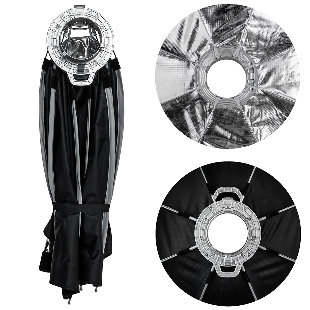 Podobnie jak softboxy serii INTENSE, MOTION i PICO, także seria SNAP może pochwalić się konstrukcją nośną poprowadzoną na zewnątrz czaszy. Dzięki takiemu rozwiązaniu, srebrne wnętrze jest pozbawione elementów montażowych, które mogłyby zasłaniać palnik lampy. Emitowane przy ich pomocy światło jest równomiernie rozłożone, miękkie i atrakcyjne. Cały stelaż - adapter Bowens i ożebrowanie - został wykonany z aluminium. SNAP 90 łączy w sobie niewielką wagę, dużą mobilność oraz wygodę podróżowania.